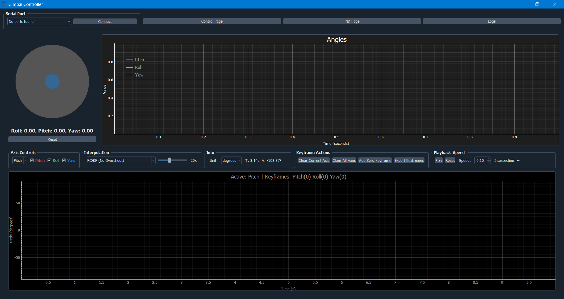 So the keyframe editor lets you click on a plot to add keyframes for each axis, pick an interpolation method (PCHIP, Akima, Cubic, or Linear, all from scipy), hit play, and the gimbal follows along. There’s a speed control too.